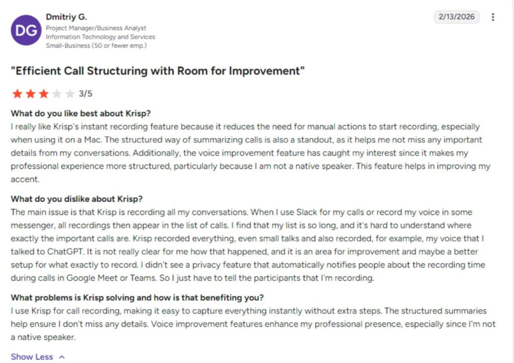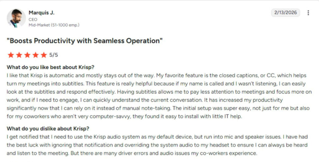 We reviewed real user feedback on Krisp AI across different sectors and teams to understand how the tool performs. The quotes below provide a quick glimpse into users’ experiences, highlighting both strengths and, at times, weaknesses. These insights complement our hands-on tests and offer a clearer picture of what to expect when using Krisp.
